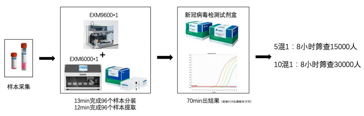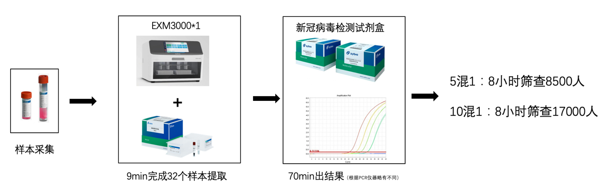 方案一:中元汇吉病毒核酸提取试剂+全自动核酸提取仪EXM3000,只需1名人员,8小时可以完成1700人份以上的检测;在10混1方案下,可以完成17000人份以上的检测量。