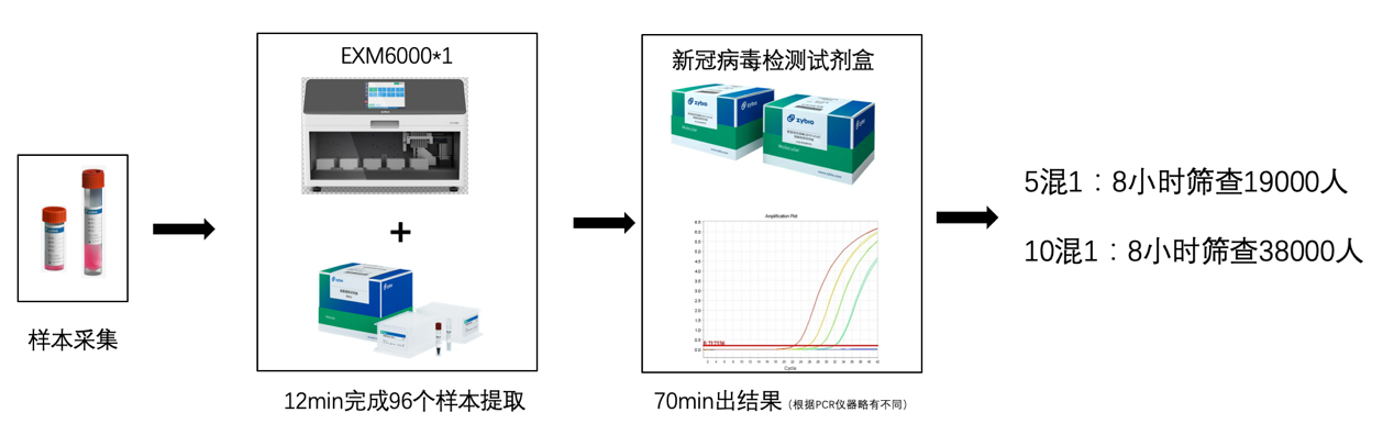 方案二:中元汇吉病毒核酸提取试剂+全自动核酸提取仪EXM6000,只需1名人员,8小时可以完成3800人份以上的检测;在10混1方案下,8小时可以完成38000人份以上的检测量。